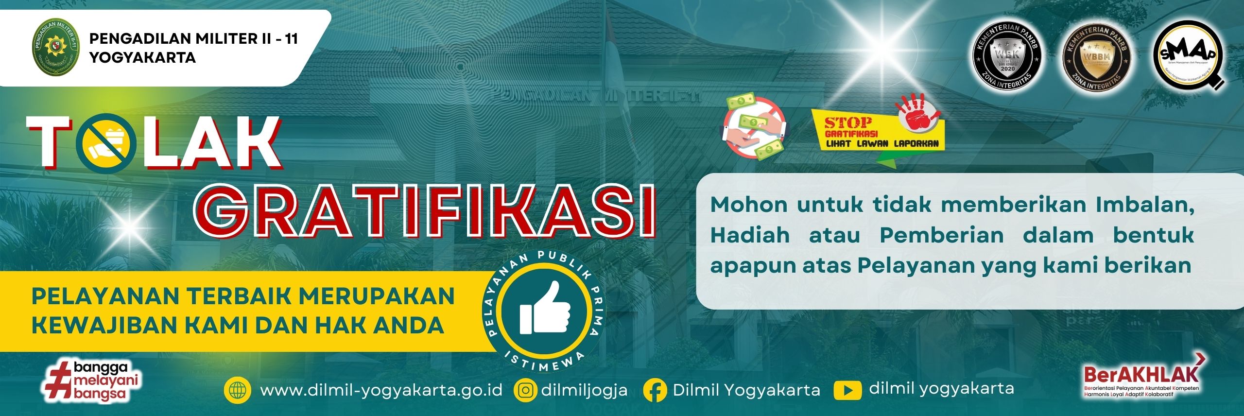 Dengan segala pencapaian yang telah diperoleh oleh Pengadilan Militer II-11 Yogyakarta seperti sebagai Satuan Kerja yang memperoleh Akreditasi “A” Excelent, kemudian Satuan Kerja yang telah memperoleh predikat Wilayah Bebas Korupsi (WBK) dan Predikat Wilayah Birokrasi Bersih Melayani (WBBM) serta sebagai Satuan Kerja dengan Sistem Managemen Anti Penyuapan (SMAP) yang telah Pari Purna, maka dengan hadirnya website ini semoga kami dapat memberikan informasi yang semakin memadai kepada para pencari keadilan dan Masyarakat sehingga dengan transparasi dan akuntabilitas ini kami dapat mewujudkan Visi Mahkamah Agung yaitu ‘Terwujudnya Badan Peradilan Indonesia Yang Agung” dengan penerapan Good Governance yang baik.