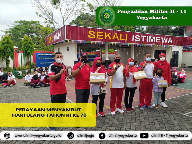Dalam rangka menyambut Hari Ulang Tahun Republik Indonesia yang Ke 76, Pengadilan Militer ll-11 Yogyakarta Mengadakan Perayaan dengan kegiatan lomba 17an yang diikuti seluruh anggota beserta para istri dan anak-anak. Kegiatan ini diawali dengan apel pagi yang di pimpin oleh Kepala Pengadilan Militer II – 11 Yogyakarta Letnan Kolonel Chk Fredy Ferdian Isnartanto, S.H., M.H. Kadilmil menyampaikan kegiatan ini bertujuan untuk meningkatkan tali persaudaraan antar anggota dan antar keluarga anggota, dalam pelaksanaan lomba tetap menerapkan protokol kesehatan.