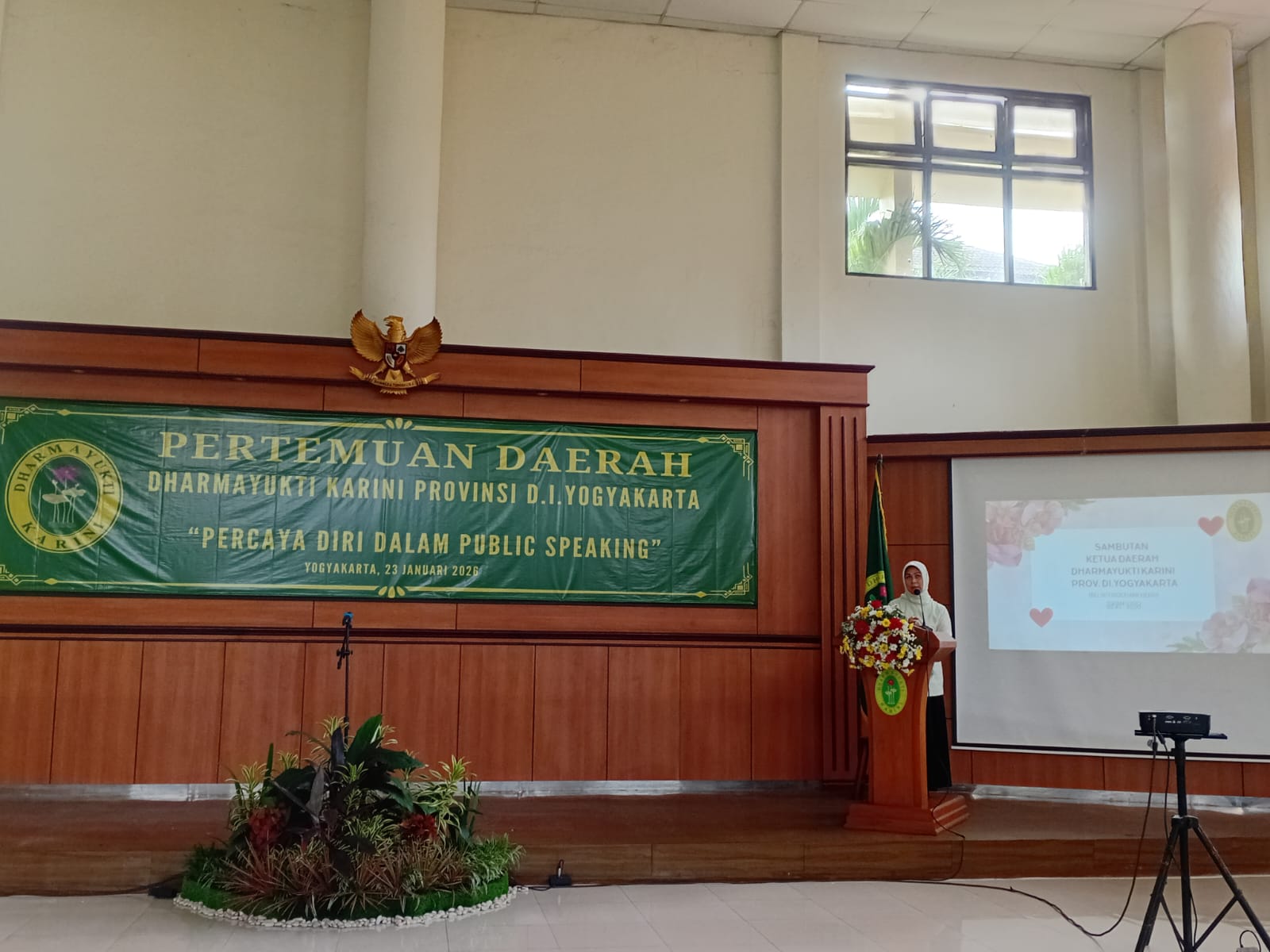 Dalam acara pertemuan tersebut, terdapat acara pengarahan dari Ketua Pengurus Daerah Dharmayukti Karini Provinsi D.I. Yogyakarta dan pemberian materi Public Speaking oleh Bapak Ferry Anggara.